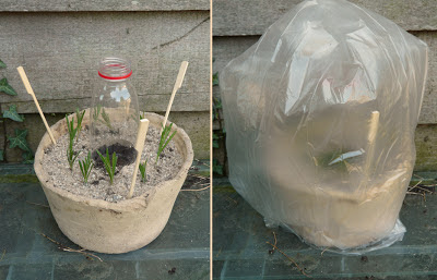Ook hier een luchtig plastic zakje over de bloempot heen om de stekjes te behoeden voor tocht en uitdroging. Warme vochtige lucht is het beste. Met wat satéprikkers maak je een frame zodat het klamme plastic zakje niet tegen de stekjes aan kan komen want daardoor kunnen ze schimmelen. Perforeer het plastic zakje hier en daar met kleine gaatjes voor de zuurstof. Verwijder schimmelende of verschrompelende stekjes meteen, al is het wel normaal dat de stekjes er even wat minder 'vol' uit kunnen zien. Als het goed gaat trekt dat weer bij.